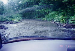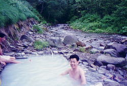 昔バイクで北海道を旅していたという、会社のKさんに聞いた無料の温泉に向かう。糠平湖から大雪の方向へ走ると、左手に「赤岳登山道入口」という木でできた看板があるので、そこから林道に入りしばらく行ったところにあるらしい。注意深く探しながら進むと、看板が見えてきた。 ![]() 林道は整備されていて走りやすい。 川を渡るのだ! Kさんによると、「最後に川を渡る」ということだ。 しばらく進むと川が現れた。川の向こう側にも道が続いている。川幅は15mくらい。 水量は浅いところもあるが、20cmくらいありそうなところもある。 「えっ?ここを渡るの?」と相方に聞くと 「当然」って顔をしている。 「怖いから車を停めて歩いた方がいいんじゃないかな・・・。」 って提案しようとしたけど、既に車は川の中だった。体がちょっと左右に揺れる。 ふう。どうにか渡りきれたようだ。でも帰りも当然渡るんだよな〜って頭の片隅でちらっと思った。 川を渡って200mくらいで行き止まり。車が2台停まっていた。左手に川が流れていて、向こう岸に数人の人が見えた。どうやらそこが目指す「岩間温泉」のようだ。早速タオルを持って向こう岸へ。向こうに渡るための丸太がある。小雨が降っていたので、滑らないように慎重に渡る。 ![]() 岩間温泉 お湯は乳白色で、いかにも温泉といった雰囲気。先客の方が数名のんびりお湯に浸かっていた(すべて男性)ので、私は遠慮することに。みのりんはうれしそうにいそいそと服を脱いでいる。あ〜気持ちよさそう〜。お湯の温度も適温のようだし・・・。こんな小雨の降る日は、いつまでも入っていたい気分だ。 気持ちよさそうなみのりんの顔をうらめしげに見ながら、私はカメラのシャッターを切ったのでした。 さて次に奥摩周温泉に向かいます。摩周方面に向かう途中、国道から右手にサイロが見える。 そこに無料の露天風呂があるというのだ。しかし、温泉らしきものは見当たらず、向かいのレストランで聞いてみると、今工事中で温泉は利用できないとのこと。残念だがあきらめた。 今日の宿は摩周温泉。 摩周温泉「ペンションビラオ」は温泉だし、露天風呂もある。夕食は洋食。ワインを注文してディナーとしゃれこんだ。 |