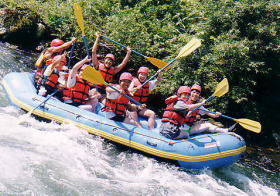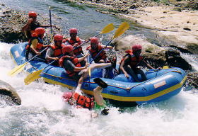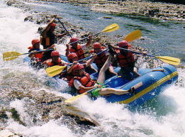この日は絶対やってみたかった「ラフティング」に挑戦 。(ゴムボートに8人で乗り、激流の川を下る遊び)びちょびちょになるので水着の上からTシャツを着ていざ挑戦。オールを持ちライフジャケットを着て、ヘルメットをかぶる。ちょっとダサダサの格好だけどしょうがないか。 インストラクターのおにいさんの合図にあわせてオールを漕ぐ。 途中流れの緩やかな場所にきたら突然「じゃウインドサーフィンいきまあーす」というやいなや、ゴムボートをひっくり返すじゃあ〜りませんか。びっくりするやら冷たいやらで、ちょっとあせったけど、ライフジャケットつけてるし、太陽はやけつくように熱いしで、慣れてきたら気ままに浮いて流されているのも心地よかった。 ![]() 激流のポイントではカメラマンが構えていて、瞬間のいいショットを撮ってく れる。みのりんは調子にのって両手放しをしてポーズを取った瞬間、ボートが岩に乗り上げた弾みで川にドボン。岩にぶつかって足と背中を負傷していた。ばかなやつ。 ![]() いやー実に楽しい3時間でした。今度はもっと水かさの多い時期にやってみたい。 一緒にボートに乗った仲間函館からフェリーに乗る前に、北海道最後の温泉を楽しみたかったので、長万部の「二股ラジウム温泉」に寄ることに。ここはドーム型の不思議な建物があったり、長年蓄積されたような石灰華があったりして、とてもいいムード。湯治客の人もちらほらみかけられた。世界的にもめずらい温泉だそうだ。おかげでラフティングの疲れを癒すことができた。感謝。 函館に到着すると、青森行きが出るまでに時間があったため、18:30発の大間行きに変更することに。しかし大間を甘く見ていた!高速に乗るまでの長い道のり!かなりしんどかった〜。 東北道に乗った後はひたすら走り続けて翌日10:00に我が家へ戻ったのでした。とても有意義 な一週間でした。家に帰ると、たまりにたまった洗濯物地獄が待っていました。 フー。お疲れ様でした。 読んでくれたみなさんもお疲れ様でした。 |
