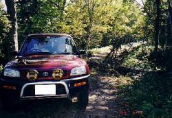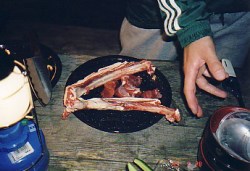6時起床。今日もいい天気。ゆっくりと朝食を食べて8時出発。 この日は然別峡まで行く予定。けっこう距離があるので、先を急ぐ。 然別峡のキャンプ場は一昨年7月に訪れた場所。とても大好きなキャンプ場だ。サイトのとなりに野趣満点の「鹿の湯」があるし、菅野温泉や川沿いの露天風呂巡りも最高。でも山の中ということもあり、9月末でキャンプ場が閉鎖してしまう。今年はギリギリセーフなので、絶対行こうと決めていた。 テントサイトは鬱蒼としたエゾマツに囲まれ落ち着いた雰囲気。人工的な明かりも少なく、キャンパーは静かに過ごすためにやってくる人が多いので、最近のうるさいばかりの関東近辺のオートキャンプ場に比べたら、20年前くらいタイムスリップした気分が味わえる場所。 炊事場が洗剤禁止と、ゴミ持ち帰りっていうのも気にいっている。自然を大切にしている数少ないキャンプ場だ。こういう場所はずーーっと残っていてほしい(^.^) まずは今回の旅行で行きたかった秘湖 『シュンクシタカラ湖』 へ。ツーリングマップルを片手に、林道に突入。 紹介されていたコースの反対側から入っていったら、すごい林道でビックリ。急な斜面あり、台風で倒れた木が道をふさいでいたりして、やっとのことで通り抜けたり。ちょっとドキドキしたよ。途中大きな木が道をふさいでいるとこは、ギリギリ車が1台通れるとこで、のこぎりで切っってあったり…木が大きすぎて退かせなかったんだと思う。 ![]() 立ち木が倒れて林道をふさいでいた。 そんな感じでどうにか 『シュンクシタカラ湖』 に到着。湖を一周しようと思ったら、途中土砂が積み上げてあって通れないようにしてあった。しかたなくそこに車を止めて、湖まで降りてみることに。 ![]() 誰もいない湖はすごく怖い。熊が出そうな雰囲気なので、熊よけの鈴を鳴らしながら、大声で話しながら湖面近くまで下りた。私は怖くてビクビクしていたので、早々に車に戻ったよ。とりあえず、写真を撮って湖を後に。帰りは逆の林道を帰ったら、すごく整備されていて走りやすかった(^^ゞ 途中 『道の駅阿寒丹頂の里』 で、すごくおいしそうなトマトを売っていたので、思わず買って、その場で二人してまるごとガブガブとかじりついてしまった(^^ゞとってもおいしかったあ。(^○^) なま野菜が不足していたせいか、ほんと胃にしみわたったよ。この辺は、結構「道の駅」が多いんだよね。とりあえず近いとこは全部回ったよ。道の駅フリークに近づいてきた。それぞれの道の駅に特徴があって特産品コーナーなんかは楽しいね。キャンプ場のトイレはちょっと???ってとこが多いから、道の駅はかなり使わせていただきました。(^○^) その後は十勝川温泉に寄ることに。十勝川温泉は、世界的にも数少ない植物性のモール温泉。肌がつるつるになるってことで、通称「美人の湯」とも言われているらしい。今回は「かんぽの宿」で日帰り入浴させてもらった。午後2時って中途半端な時間だったせいもあって、先客はおばあちゃん2人。日当たりのいい浴槽でゆったりのんびり。たしかにお湯がぬるっとしていて、美人肌になりそうな気分だったよん(^^ゞ 然別峡のキャンプ場は、瓜幕から10キロくらいダート道を行くので、しっかり大きな町で夕食材料を買い込んでいくことに。帯広市内の大きなスーパーで食材選び。大きな町だけあって、すごく品揃えも豊富だったよ。そして一路然別峡へ。2年ぶりに通る道々、わくわくしちゃったよ。ダート道で結構たくさんの車とすれ違ったので、きっと日帰りで「鹿の湯」か「菅野温泉」へ行ったんだろうねって話をしていた。 キャンプ場に着いたのが午後5時すぎ。そろそろ暗くなってきていたので、早めに場所を決めてテントを設営。 せっせと作業をしていると、ウエスタン風に決めた、お兄さん?おじさん?(どっちとも取れるくらいの年齢)がやってきた。 (ウエスタン)「こんばんわ〜もう夕飯食べちゃいました?」 (あいかた) 「いえ、これから作ろうと思ってるとこです」 (ウエスタン)「よかったあ〜。鹿肉食べません?」 (あいかた) 「鹿肉ですか???」 ウェスタンさんにもらった鹿肉ウエスタンさんがおもむろに大きなビニール袋を広げる。そこには多量の鹿肉が! (ウエスタン)「いやー、昨日撃った鹿をたくさんもらっちゃったんですけどこんなに食べきれないから、 少しもらってください」 (あいかた) 「すごいですね〜。せっかくですからいただきます!! 散弾銃のタマとか入ってないで すよね(笑)」 (ウエスタン)「うふふ、そりゃ〜入ってないですよ(笑)」 相方がお皿を出してきて、アバラ骨の付いたスペアリブの部分を2本と、足の部分のお肉の塊をいただいた。 (わたし) 「どうやって食べるのがおいしいですか?」 (ウエスタン)「ぼくは、炭火で焼いて、塩コショウだけで食べたけど、 うまかったよ」 (わたし) 「なるほど、早速やってみます。ありがとうございま〜す!」 って感じで、めずらしい鹿肉をGET。めず