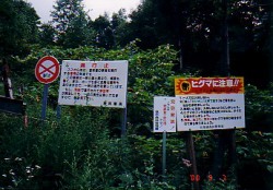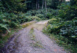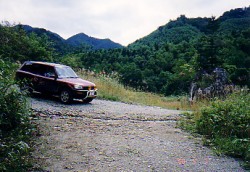 久しぶりの布団で目覚めると、外は朝もやでした。6時から露天風呂に入れるので、早速朝風呂を楽しみました。朝食を食べ終わる頃には、徐々に霧も晴れ始め、いいお天気になってきました。 8時半にニセコを出発して、一路島牧村を目指します。 10時には、林道スタート地点の宮内(ぐうない)温泉に到着。 左に行けば宮内温泉、まっすぐは行き止まり、右は、金花湯へつづく林道の始まりです。まず、詳しい金花湯へのルートを教えてくれた方のメールを片手に車の走行距離を0にリセットしました。 いよいよスタートです。 金花湯へのルートを詳しく教えてくれた方からメールは、次のような書き出しになっていました。 ***************************************************************************** >チャレンジの際、留意すべき点として、 >1.単独での入林はおすすめできません。最後は約1キロほど徒歩になりますの > で、熊との遭遇が心配されます。私は歩いている間、友人と2人で馬鹿でか > い声で話し続けていました。(これも結構辛いモノがありますが。ハイ) >2.国土地理院の地形図はあまりあてにならない。 > ・温泉の位置は確認できても、林道の分岐が多く、途中走っている間に自分の > 位置を見失いやすい。国地院の地図には温泉マークもない(五万分の1) >3.最後の徒歩には長靴が必要です。 >4.入林届は必ず出しましょう。(林道のゲートの横にあります。下山の際の記入も) >5.入林は午前中の方がいいと思います。 > ・宮内温泉を出発して金花湯まで最低1時間半はかかります。温泉でゆっくり > して、帰路のことも考えると…。夕方は熊もヤバイし…。 > ・入林届を見ていたら「夕方になってしまってあきらめた。」「どこにも温泉 > がない!」というコメントも書かれていました。 ***************************************************************************** こんな感じなのです。かなりの覚悟が必要ですよね。実家のオババに、このメールを見せたのですが、「お願いだから、こんな怖そうなとこに行かないで!」って懇願されました。 しかし、私達の決意は変わりません。無事かどうかを連絡するってことを条件に許してもらいました(^^; 右の林道に入って500mくらいは、畑や小屋もあり、人が生活している雰囲気が漂っていました。 しかし、小さな橋を渡り奥に進んでいくうちに、そんな安心感もなくなり、北海道独特の林道の風景になってきました。 この人のアドバイスを信じて、かなり踏まれた林道をひたすら進みます。 3kmほど過ぎたところに車が置いてあり、その先に、おじさんが座っています。どうやら電動の草刈機の刃を交換していた様子。林道の整備をしていたようです。私達の登場にかなりびっくりしていました。そりゃそうですよねえ。こんなとこを通る車があるなんて想像していないでしょうから。おじさんには申し訳なかったのですが、ちょっと避けてもらって先へ進みます。 メーターのカウンタがなかなか上がらない気がして心臓がドキドキ。もし5km以上走ってもゲートがなかったらどうしよう・・っと・・・・・・。 メーターの数字が5Kmを過ぎたあたりで、左にカーブをすぎるとゲートが見えてきました。 よかった〜。 まずは第一段階突破。とりあえず車を降りて様子をみてみましょ。 看板類幸いゲートは開いていました。 しかし、メールをくれた方が言うような、「入林届」らしきものは見当たりません。脇には「熊出没注意」って大きな看板が立っていて、営林署の看板には、「入林する場合は何があっても責任をとらないので個人の責任で」みたいなこと書いてあるし…。 ドキドキする要素がまた増えちゃったけど、ここまで来たら行くっきゃないでしょうってことで、車に乗り込みゲートをくぐりました。入林届がなかったことがちょっと不安ですが、まあしかたないでしょう。 ゲートをくぐった後ひたすら進む。どうやらうちの車の示す走行距離と、教えてもらった距離では200mくらいずれているようだが、ここまでは指示どおりの道を来ているような気がする。 それにしてもどこまでも林道が続いていて、森に迷い込んだヘンデルとグレーテルの気分になる。本当にこの道でいいのか? 常に疑問が頭をかすめる…。走行距離のメーターとにらめっこ。こんなにずっとメーターを見てたことは初めてだ。 路面は、奥に進むにつれて、ガレ道になってきた。崖から落ちた石が沢山落ちていたり、雨水の通った後が深くえぐれていたり、まだ水溜りの残っている場所があったり…。 できるだけ慎重に車を進めるみのりん。メーターをにらむ私…。 北海道の林道を走るのは慣れているつもりだったけど、甘かった。今まで走ったどの林道より荒れている。メールで指示されたとおりに、作業道と合流した後、橋が現れるのをひたすら祈る…。 あっ!!最初の橋だ!! ほんとにガードレールが黄色に塗ってあるぞ。かなりくすんで色が抜けかかっていたが、確かに黄色だ!! 勇気を出して進み続ける。そしてオレンジ色の橋と白色の