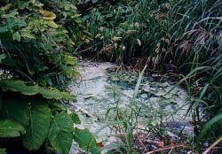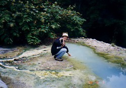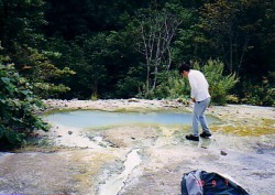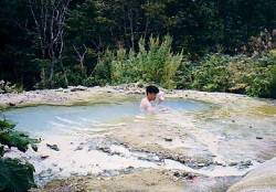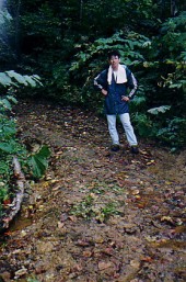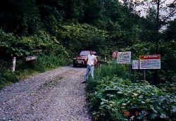 粘土質の土と下り坂に阻まれてタイヤが空回りしたが、少し前へ出てもう一度思いっきりアクセルを踏み込むと、どうにか脇の雑草のスペースへ車体を入れることに成功。しかし前は岩場で、少ししか車を前に出すことができない。 この時、さっきえぐられた部分に枯れ木をはめ込んだことが役に立った。 前に立ちはだかる岩場ギリギリまで車を数十センチ前に出す。はめ込んだ枯れ木の上に前輪を乗せ、もう一度車を切返すことができたのだ。ただし、雑草の生えているスペースの右側にも大きな岩場があり、車体は、ぎりぎり一杯。 もう一度バックして切り返す際に、私は、「こうなったらちょっとぐらい車が傷ついてもいいや!」という気持ちで岩ギリギリまで「オーライ。オーライ」(本当は全然オーライって感じじゃなかったけど)と誘導し、何度か切返した結果、やっとUターンして坂を登ることに成功した。 RAV−4って意外と大きいんだなあ。こんな細いカーブで、よくUターンできたよ。みのりんってかなり運転技術があるのかしら?なんて思ったりして。 最大の危機が去った瞬間、また恐怖が襲ってきて、急いで助手席に乗り込むと最後のカーブまで勢いよく上り坂を戻った。 どうにか最後の急なカーブの手前まで戻り、スペースを見つけて駐車すると、改めてかなりヤバイ状態だったことを再確認。二人とも暑さでは出ない汗で全身じっとりとしていたよ。 よくよく考えてみると、もしあの場でスタックし、車を動かせない状態になった場合、27Kmの道のりを熊の恐怖に怯えながら宮内温泉まで戻り、助けを求めにいかなければならなかった。 もし、戻る途中に足を踏み外したり、熊に襲われたりした場合、入林届を書いていない私達の存在は誰も知らないから、救助を待っても誰も来ないわけだ。望みとしては旅行から帰ってこない私達を心配した両親が、「金花湯周辺を捜索してください!」って訴えてくれるのを待つか、林道入り口で作業をしていたおじさんが、「そういえば、あの車戻ってこないなあ?」と疑問に思ってくれるかを期待する程度しかない。それにしたって捜索開始まで2〜3日はかかるだろう。時間が経過するにつれて逆に恐怖が増してきた。 こんな思いまでして27Km進んできたのだから、金花湯を体験せずには帰れないという思いが強くなった。(その思考がちょっと変?な二人) 完全防備で金花湯を目指そうと準備をしていると、背中の右側に「チクッ」っと強烈な痛み。 「痛い〜!」何かに刺されたみたい。その数秒後、今度は背中の左側に「チクッ」とした痛み。「痛い!痛い!」 急いでTシャツをめくりあげて、みのりんに背中を見てもらったんだけど、何にもなっていない様子。虫に気をつけなきゃって話をしながら、長袖で防備して、首にはタオルを巻き、帽子をかぶって軍手をはめて、これで大丈夫だろうと車の外に出ると、すぐに「チクッ」っと左耳上部に痛みが走りました。「痛い!」思わず耳に手をあてると、蚊の小さな感じの虫がつぶれていました。 さっきの背中の痛みと同じだったので、たぶん同じ虫なのでしょう。まったく油断できませんね。私の様子を見たみのりんは、長袖のTシャツだけでは不安になったようで、少し暑かったけど、ウインドブレーカーを着ることに。だってさっきは私も背中をTシャツの上から刺されたくらいですから。 準備を整えた二人は、携帯用のラジオを首からぶら下げて、電波が入りやすいNHKの周波数にダイヤルを合わせ、大音量でかけながら進みはじめました。スタックしそうになった道を徒歩で進み、改めてすごいとこへ車で入り込んじゃったことを再確認。滑らないように注意しながら下っていきました。 800mくらい歩くと川にぶつかりました。どうやら、メールでいただいた「最後は800m徒歩」という所まで車で入りこんだようでした。ほんと危なかった〜。 渓流の向こう岸に、道らしいものがあるかどうかを探しました。道と呼ぶのかわからないような、腰を屈めて進むような小道がありました。童話の「不思議の国のアリス」に出てくる、アリスがうさぎの後をつけていくようなイバラの小道って感じです。 急流に足を取られないように、近くにあった枝を杖代わりに使って、石の上を進み、やっとのことで向こう岸に到着。小道の奥の方を覗き込んで確認してみました。ちょっとぬかるんでいますが、足跡を発見。(もちろん人間の。熊じゃありません。念のため) 絶対ここでいいんだ〜。っていう確信を抱きつつ、腰を屈めて進み始めました。 左右そして上まで、雑草のような木々が茂っているので、腰を屈めないと進めません。掻き分けながら、ぬかるんだ道を進みます。いただいたメールに「最後の徒歩には長靴が必要です」って書いてあったのは、このぬかるんだ道があるからなんだな〜。と思ったけど後の祭り。トレッキング用の靴をはいてきてしまったので、中まで水は入るし、ぬかるみで無残にもドロドロです(^^; そんなことを