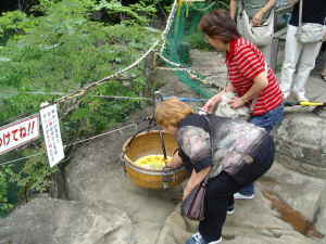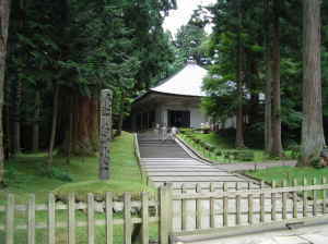 | 7/17(木) 仕事から帰って、準備をしてお風呂に入ってから近所のとんこつラーメンのうまい店で食べて22:00出発。空腹すぎて気分が悪くなり、結局とんこつの強烈なにおいにやられてだいぶ残してしまった。残りを相方に任せたので、ほぼ二人前を平らげた相方は、大汗をかいていた。すいませんなあ・・・。みなさんも空腹時のとんこつには要注意ですよ。 今回も一般道の旅。4号線をひたすら北上することにした。23時すぎには相方に睡魔が襲って危険だったのでコンビニで休憩後運転交代。小雨のぱらつく国道4号線だったが、2車線の区間が多く、夜間のためトラックばかりでもかなり快適に走ることができた。相方は助手席をフラットに倒して爆睡中だったので、ラジオが旅の友。ナイナイのオールナイトニッポンなんぞを聞きながら福島を通過。深夜2時過ぎに相方が起き出して運転を代わってくれてからは私が爆睡。いびきまでかいていたらしい。 明け方仙台を通過。相方が腹痛でコンビニのトイレに駆け込むところで目がさめた。やっぱりとんこつを2杯食べさせたのがいけなかったのかな?などと考えつつ運転を再度交代。コンビニを通過する度にトイレに行くか確認していたが、しばらくすると眠ってしまったようなので、そのまま走り続けた。道の駅三本木でしばし仮眠。のつもりが、3時間近く寝て起きたのが8時を過ぎていた。顔を洗ってさあ出発。 岩手に入ると、雨も止んできた。まずは、景勝地の「厳美渓」へ寄ってみた。生憎のお天気にもかかわらず結構観光客の姿も見られた。写真をとりながら、人のむらがっている場所へいってみると、なにやら籠の中にお金をいれている。入れ終わったら木槌のようなものを「コン」と叩いた。すると、籠が川を挟んで対岸の方へするすると登っていく。どうやら対岸のおまんじゅう屋さんまでロープが伸びているようだ。しばらく眺めていたら、今度は籠がすごい勢いでこちらへやってくる。中には、おまんじゅうとお茶の入ったやかんが!いろんな商売を考えるものだなあと感心してしまった。 籠にお金を入れる→お饅頭が対岸から! さて次は、有名な金色堂のある中尊寺へ向かいます。さすがに観光地だけあって観光バスや団体客の姿が目についた。参道は日光街道に杉並木のような巨大な杉に囲まれている。杉の木一本一本に番号の札が打ち込まれているのが気になった。緩やかな上り坂が続くので、結構しんどい。入場料一人800円を払って、まずは宝物館へ。相方に奥州藤原氏3代までを述べよって言われたが、みんな「衡(ひら)」がつくことくらいしか覚えていなかったのでバカにされた。ちなみに正解は、藤原清衡、基衡、秀衡、です。日本史をとっていた人は覚えているかも。(私も日本史とってたが・・・)金色堂は、現在コンクリートの外壁にかこまれ保護されている。建物内に入って黄金に輝く堂を見てさすがにびっくりした。栄華を誇った藤原氏を彷彿とさせる。説明のテープを聞くまで恥ずかしながら知らなかったのだが、中央の須弥壇の中に清衡公、向かって左の壇に二代基衡公、右に三代秀衡公の御遺体と泰衡公の首級が納められているとのこと。なるほどそういうことかと妙に納得してしまった。堂内撮影禁止のため写真がないのが残念。 中尊寺 金色堂 中尊寺の中には、その他に、能舞台や、コンクリートで覆われる前に使っていた金色堂の外側を保護する建物(覆堂)も移築されて残っていた。芭蕉などは、この建物の中にほの暗く光る金色堂を見ていたのだななどと想像するのもまた楽しいもの。ここで芭蕉の一句。「五月雨の降り残してや光堂」金色堂を光堂と称したのも、仏たちと人との間に介在する光と、その光の彼方にある盛衰の歴史に芭蕉がまなざしを向けていたからなどといわれる。 1時間以上中尊寺を楽しんで駐車場近くまで戻ってきた。お昼を過ぎてお腹も減ってきたので、おみやげ&食堂のようなお店に入る。盛岡の冷麺があったので、二人とも揃って注文。やっぱりおいしい。盛岡冷麺大好き〜。 盛岡冷麺 お腹も満足して、次に向かったのは、「幽玄洞」。鍾乳洞があるらしいのだ。ちょっと入口で料金を確認しようかと思った程度だが、「いらっしゃいませ〜」と声を掛けられてしまった上、私たちのほかに誰もいないひっそりとした状況だったので、タイミングを失い、しかたなく一人1000円という料金を支払って鍾乳洞へ・・・。前にあぶくま洞へ行ったことがあるのだが、その小型版といったところか。ただし、私たち以外誰もいないという恐怖があった。その上坑道が狭く、結構怖かった。とりあえず声を出して進もう。上からしずくは落ちてくるし、足元も濡れていてすべりそうだ。ちょっとした探検気分が味わえたのでよしとするかな。外に出たとたんに相方のメガネが真っ白に曇ったのが笑えた。 次は、げいび渓だ。船で渓谷を観光するらしいのだが、今ひとつそそられるものがなかったので、船に乗った人た