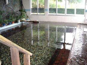 自噴の掛け流し温泉。大きな湯船の底には玉砂利が敷きつめられており、足の裏に心地よい刺激が…