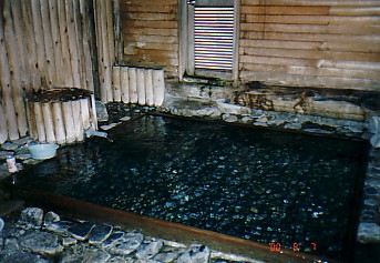 広々とした露天風呂は砂利が敷き詰められていて池のようだ。お湯はぬるめ。